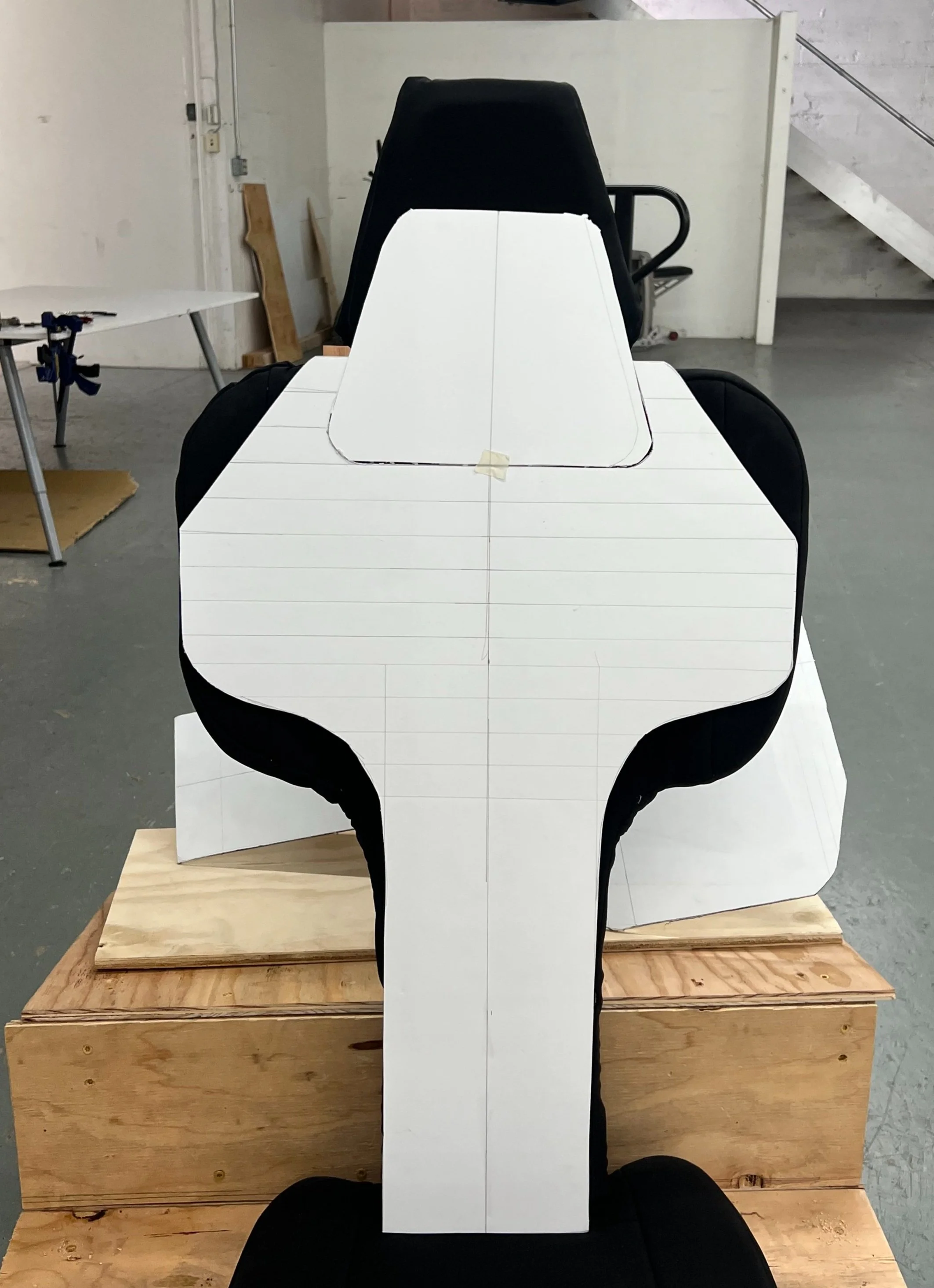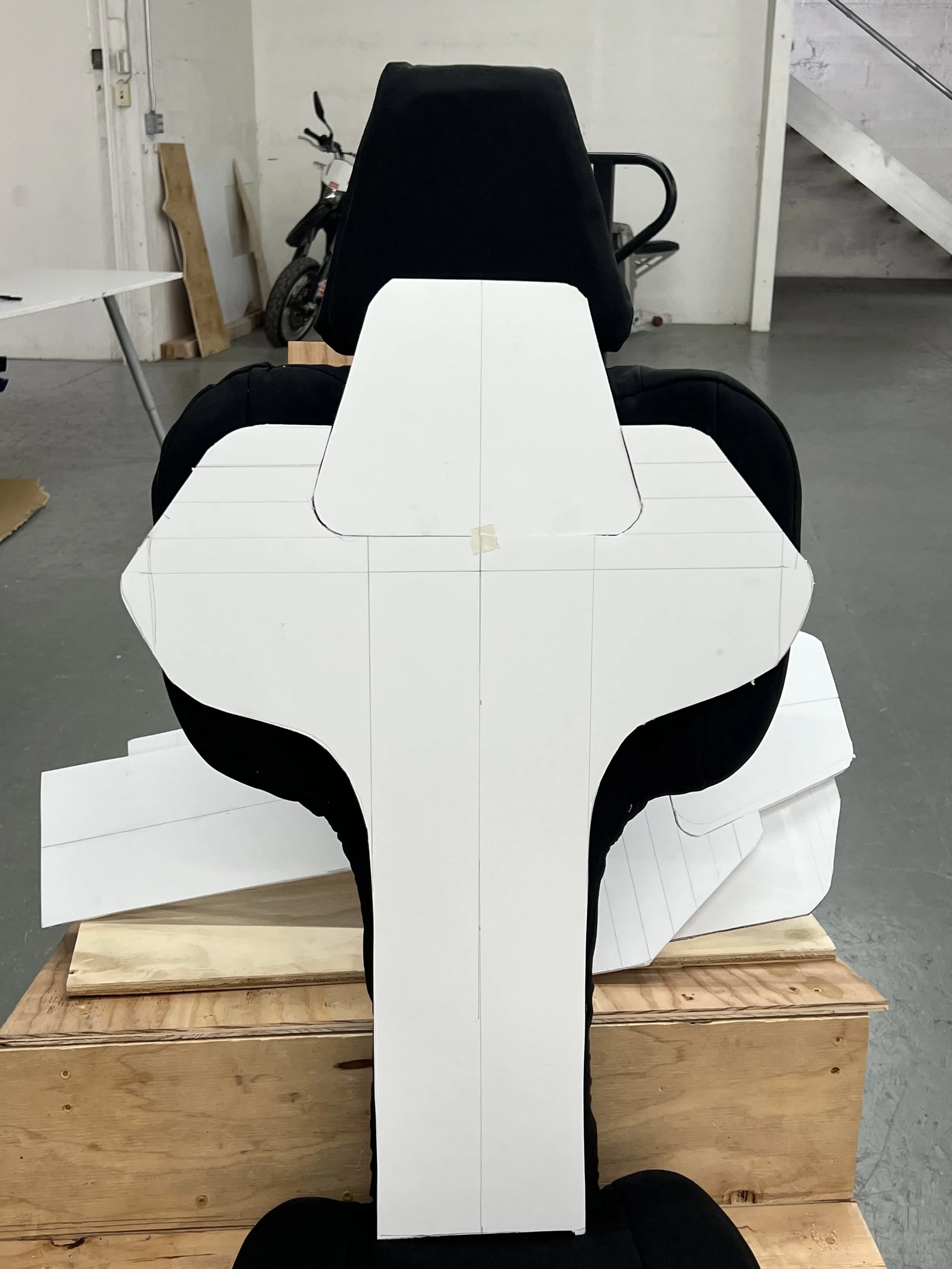For the next chair I did a series of foam board cut-outs with altered dimensions. It was also decided that the chair needed the ability to fold to allow for the second passenger easier entry. The chair needed to fold in a way to clear the steering wheel which resulted in another point of folding at the headrest.