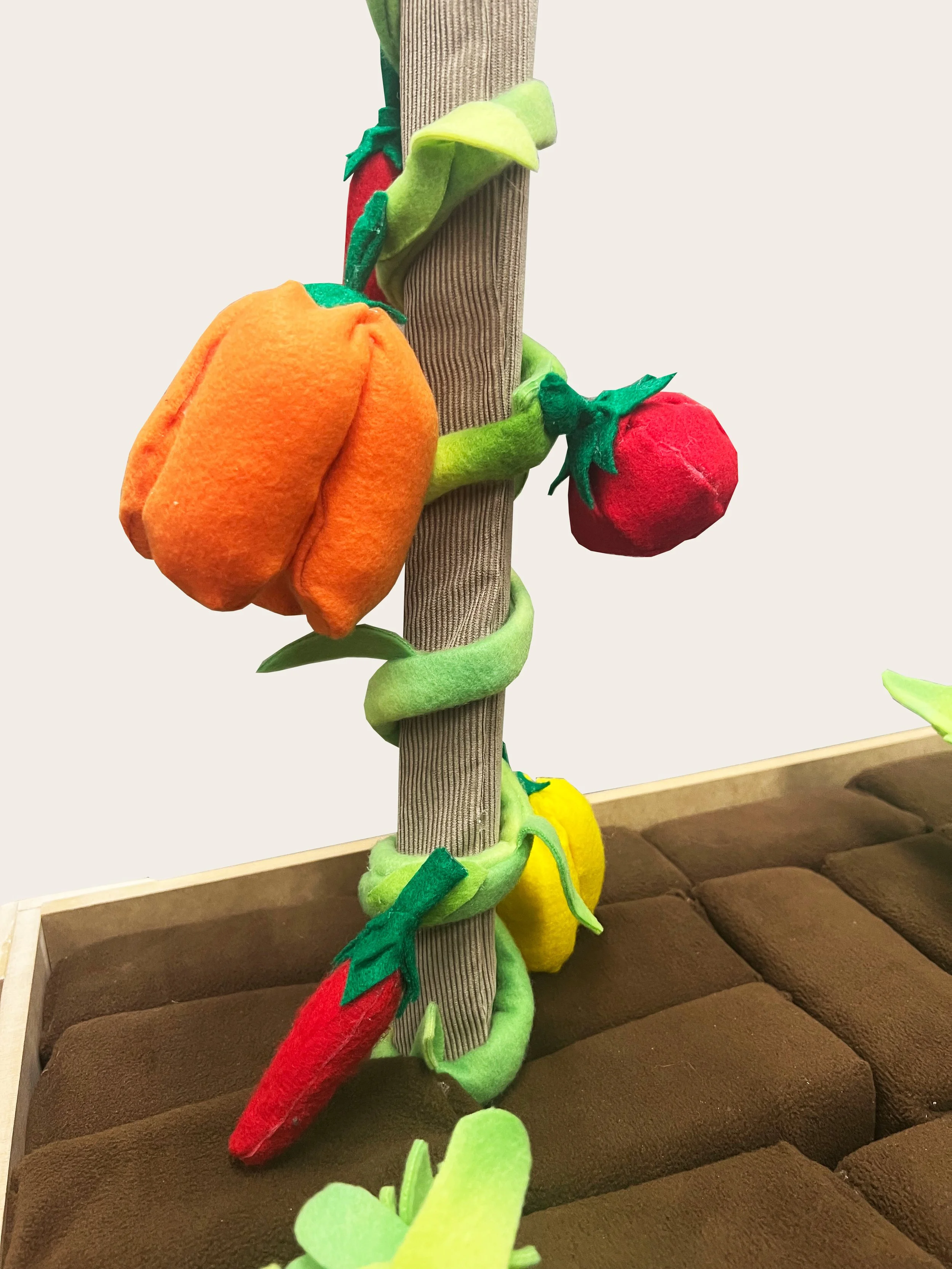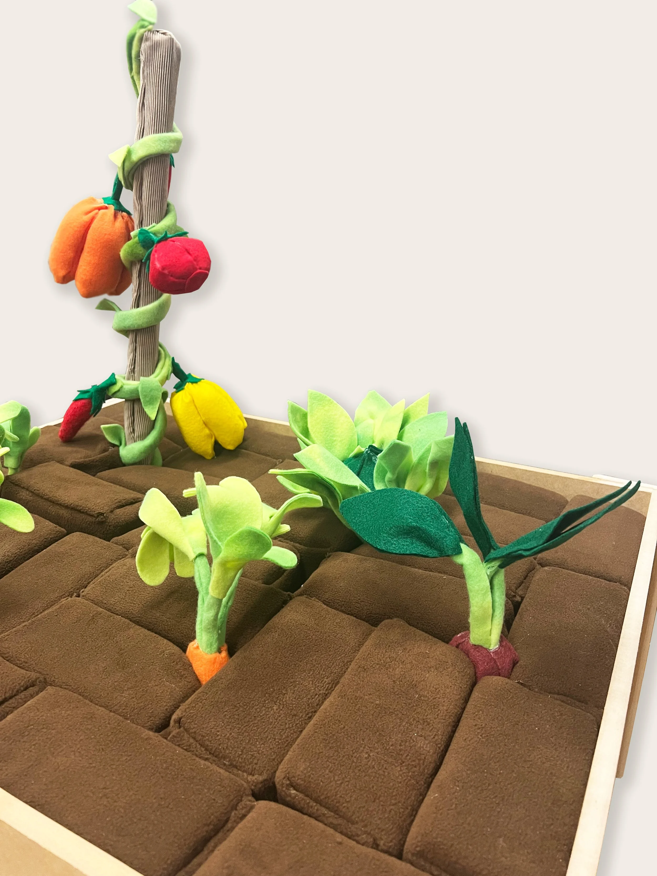 The Garden is a toy product for children I designed, and prototyped using user research. I created an indoor garden bed filled with soft, fleece wrapped cubes of dirt that create the crop grid, and various root vegetables and vine vegetables to play with and plant in the garden. The bed container has a drawer for storage. The garden bed is made from MDF and the plants are sewn fleece stuffed with Polyfill, and upholstery foam. The vine vegetables have hidden magnets in the stems that help easily connect to the vine on the post that also has magnets throughout.